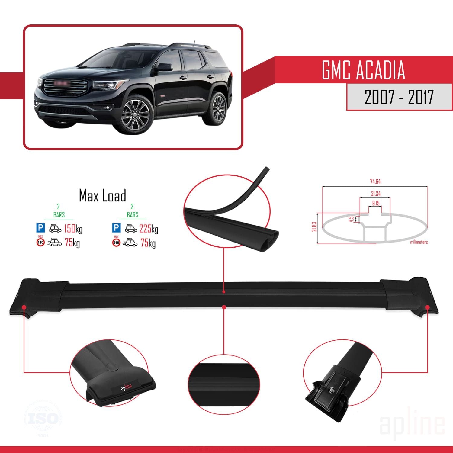 Compatible with GMC Acadia 2007-2017 FLY Model Car Roof Rack Cross Bar Black Aluminium 2 Bars