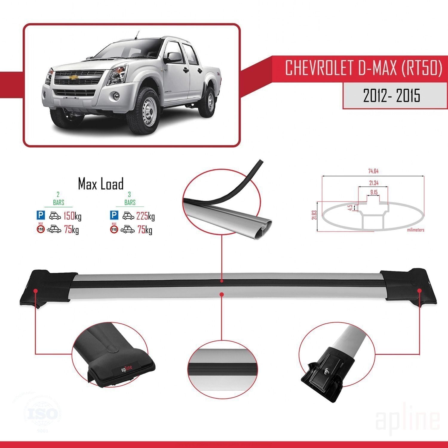 Compatible avec Chevrolet D-Max (RT50) 2012-2015 FLY Model Barres de Toit Railing Porte-Bagages de Voiture Gris Aluminium 2 Barres