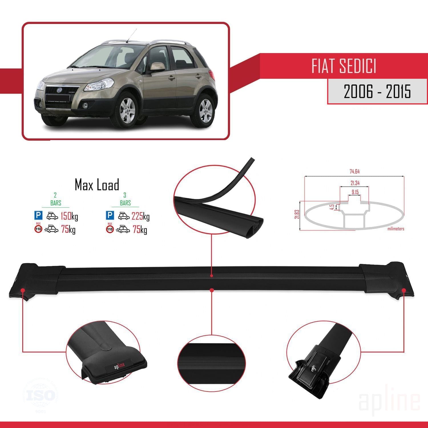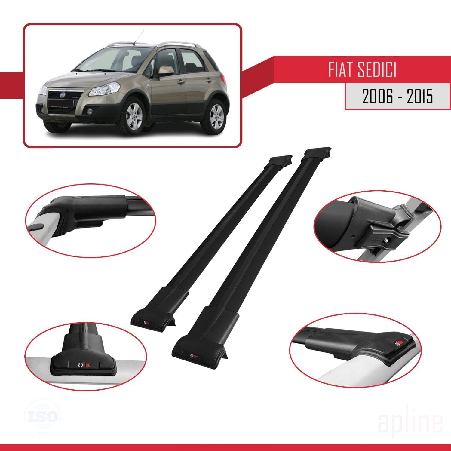 Compatible avec Fiat Sedici 2006-2015 FLY Model Barres de Toit Railing Porte-Bagages de Voiture Noir Aluminium 2 Barres