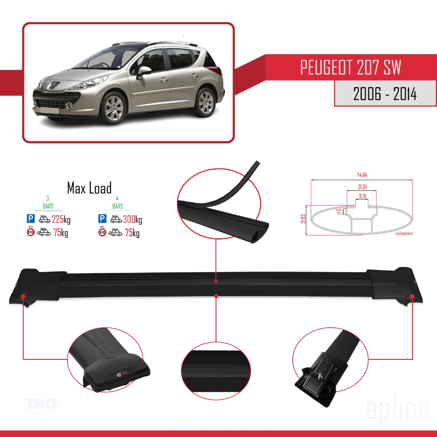 Compatible avec Peugeot 207 Break 2006-2014 FLY Model Barres de Toit Railing Porte-Bagages de Voiture Noir Aluminium 3 Barres