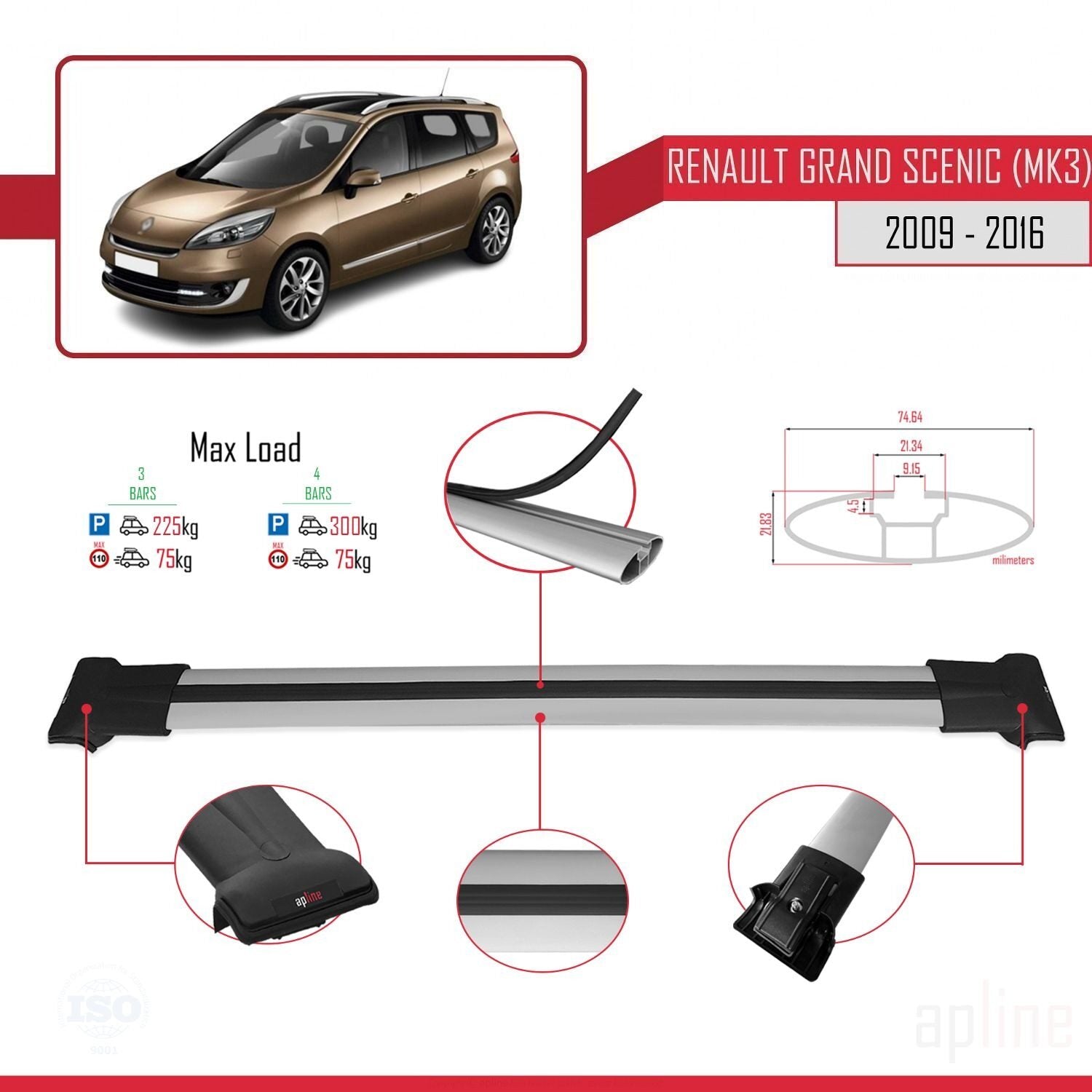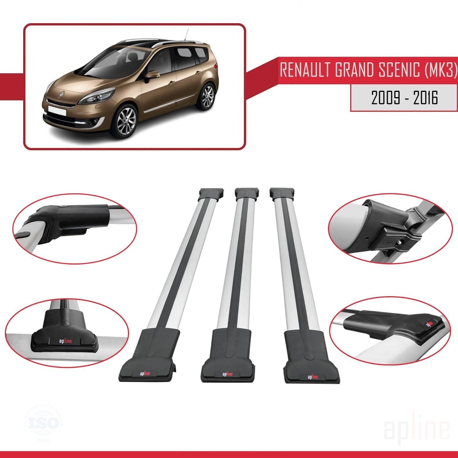 Compatible avec Renault Grand Scenic 3 2009-2016 FLY Model Barres de Toit Railing Porte-Bagages de Voiture Gris Aluminium 3 Barres