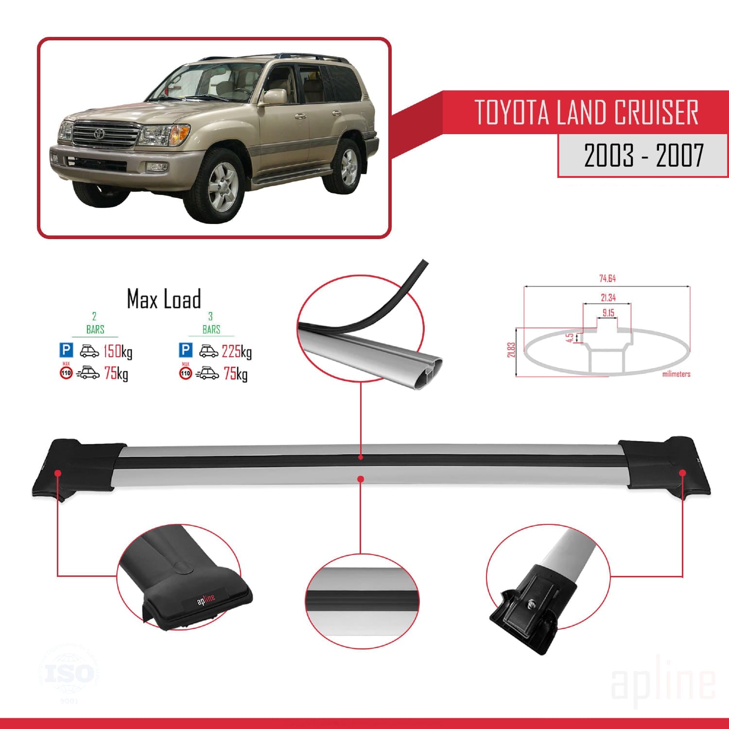 Compatible avec Toyota Land Cruiser (J100) 2003-2007 FLY Model Barres de Toit Railing Porte-Bagages de Voiture Gris Aluminium 2 Barres